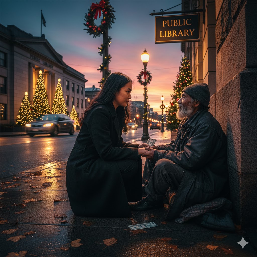 After my husband died, I got a new job, and every day I would leave some money for an elderly homeless man who sat outside the library. One day, when I leaned down like always, he suddenly held my hand and said, “You’ve been far too kind. Don’t go home tonight. Stay in a hotel. Tomorrow, I’ll show you something.