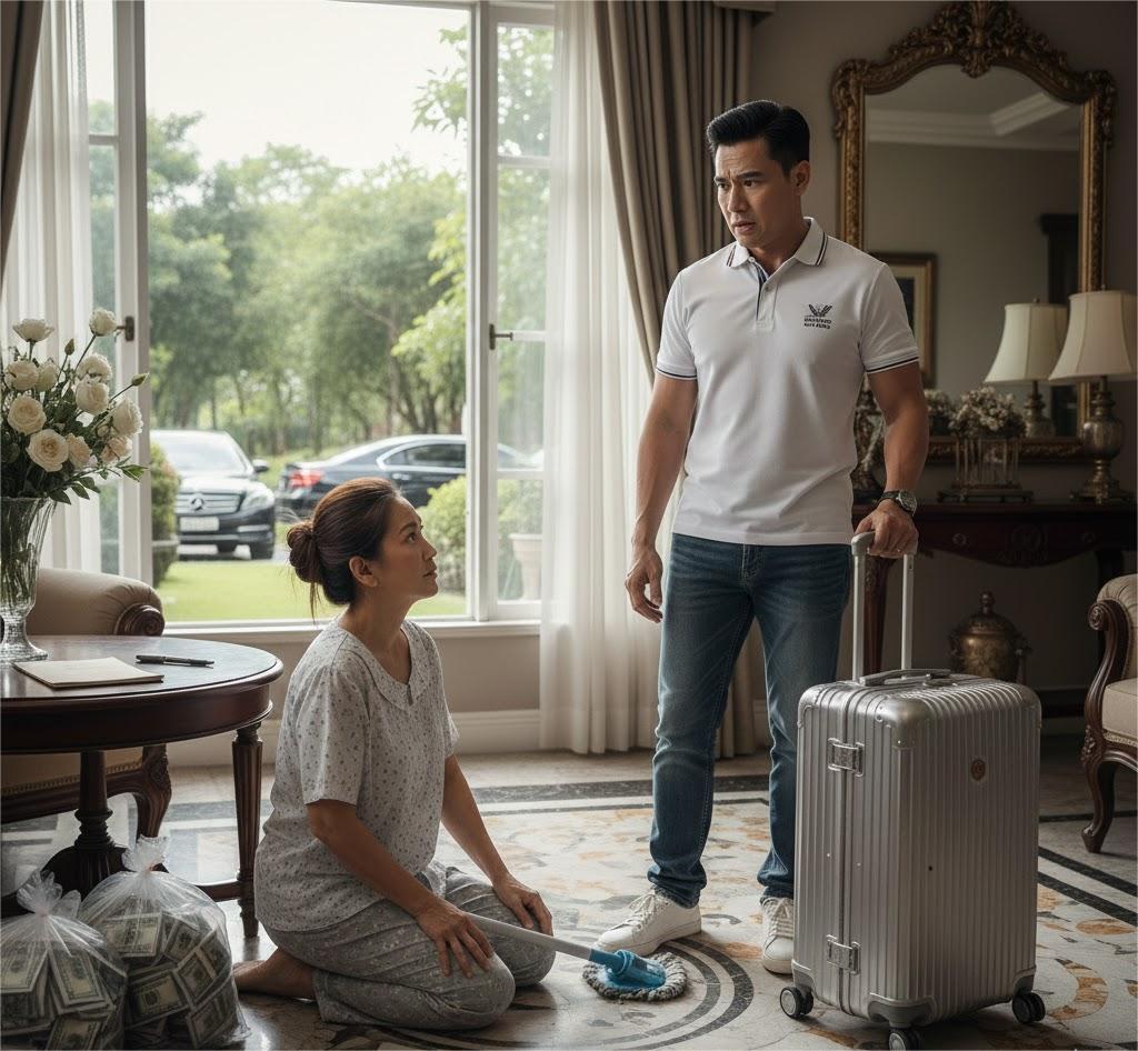 The sound of the suitcase wheels dragging across the tiled floor was irritating and deafening, much like Tan’s laughter at that moment. He stood in front of the mirror, adjusted the collar of his designer shirt, sprayed a bit of Chanel cologne, and then turned to look at Lien—his wife who was busy wiping the floor, wearing old and faded loungewear.