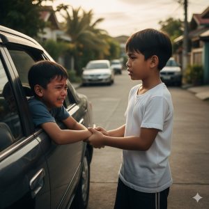 Suddenly his eyes fell on a gray car parked on the curb. In the passenger seat was a small boy, about the same age as his brother. The boy was crying, banging on the window with his fists and calling for help in a loud voice. His cheeks were red and he was breathing heavily. It was clearly very hot inside the car. No adults were in sight.