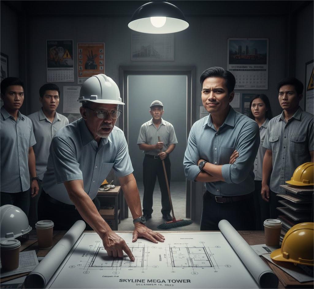 Mang Tasyo took off his old cap, revealing silver-white hair and a long scar on his forehead—the mark of a construction site accident from many years ago. “Sir Villareal, actually, we met 20 years ago in Dubai. I am Tasyo, the former Senior Civil Engineer of an international construction firm. I was the lead structural auditor for the Burj Al Arab. But after a family tragedy and my wife’s terminal illness, I lost all my assets and had to return home to work any job to pay off debts. I mop floors not because I lack knowledge, but because I need a job to survive.”
