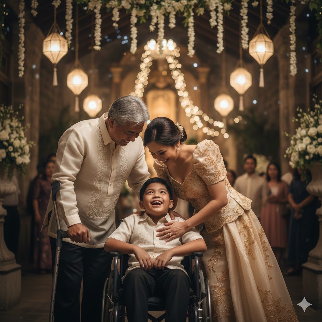 I was wearing a black suit and holding a crutch. I was standing in front of the altar, trembling and not because of nervousness but because of joy. As the church door opened, Maya appeared, wearing a white dress, with Luis who had escorted her, holding the flower and riding in his wheelchair.