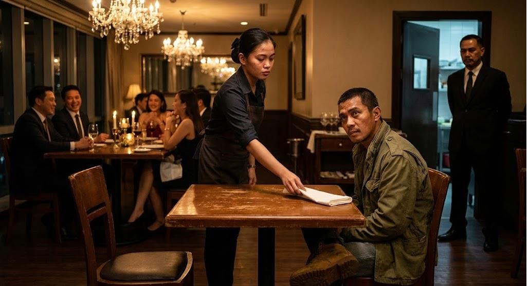She led him past crystal chandeliers and velvet booths… then stopped at a small, uneven table near the kitchen door. Heat, noise, and the smell of oil clung to the air.