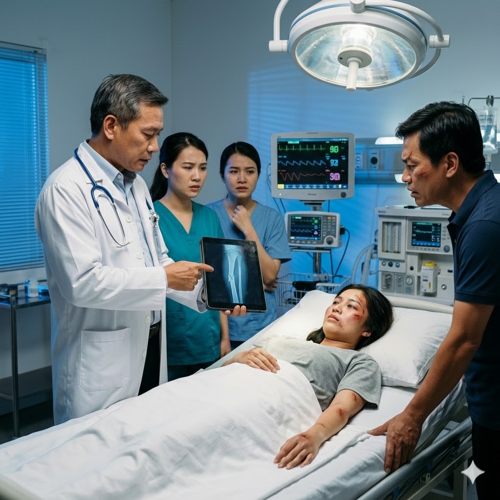 “She has multiple soft tissue injuries caused by repeated external force. But what we need to discuss now is… the additional test results for you.”