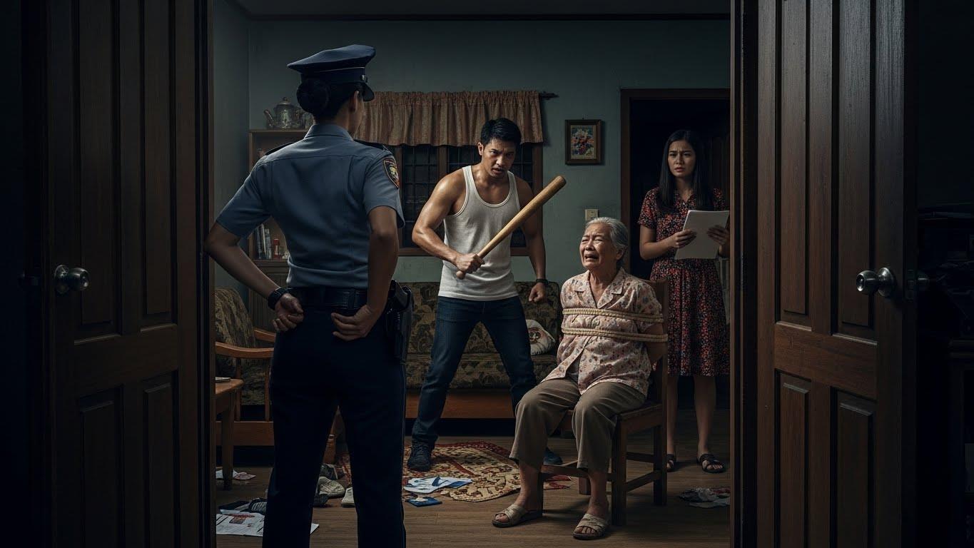 I threw my police cap onto the sofa, my eyes locking onto Mark with lethal intensity. I walked slowly but deliberately toward my mother. — “Untie her.”
