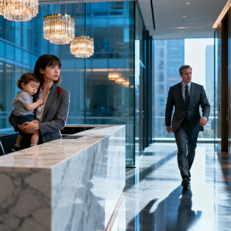 The elevator chimed softly as it opened onto the executive floor of Grant & Co., releasing a faint breeze of conditioned air that carried the scent of expensive leather and lemon polish. It always smelled that way up here — like success, like power, like a world several floors above normal life. Autumn Wells stepped out with her daughter, Ellie, perched sleepily on her hip. She hoped no one would notice them — especially not the woman behind the marble reception desk whose heels clicked irritation every time someone inconvenienced her.