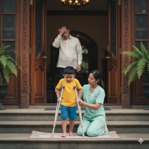 In the following weeks, Enzo stayed home to observe. He realized that every afternoon after dinner, Lani spent about an hour practicing with Nico: from moving her arms and legs, sitting up—standing up, to taking small steps. There was no sophisticated medical equipment, no fancy treatment room—just an old carpet, a monobloc plastic chair to lean on, and Lani’s endless patience. There were times when Nico was so exhausted that he cried and fell, but Lani didn’t scold him; she gently stroked him, wiped his sweat, and then encouraged him in a rustic accent.