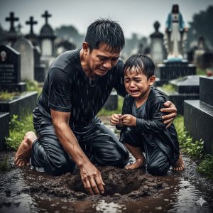Mang Ramon ignored all of this. He just quietly prepared offerings, burned incense and asked his wife’s permission in front of the grave. Little Jomar stood next to him, his eyes red, his hands tightly holding his father’s shirt.