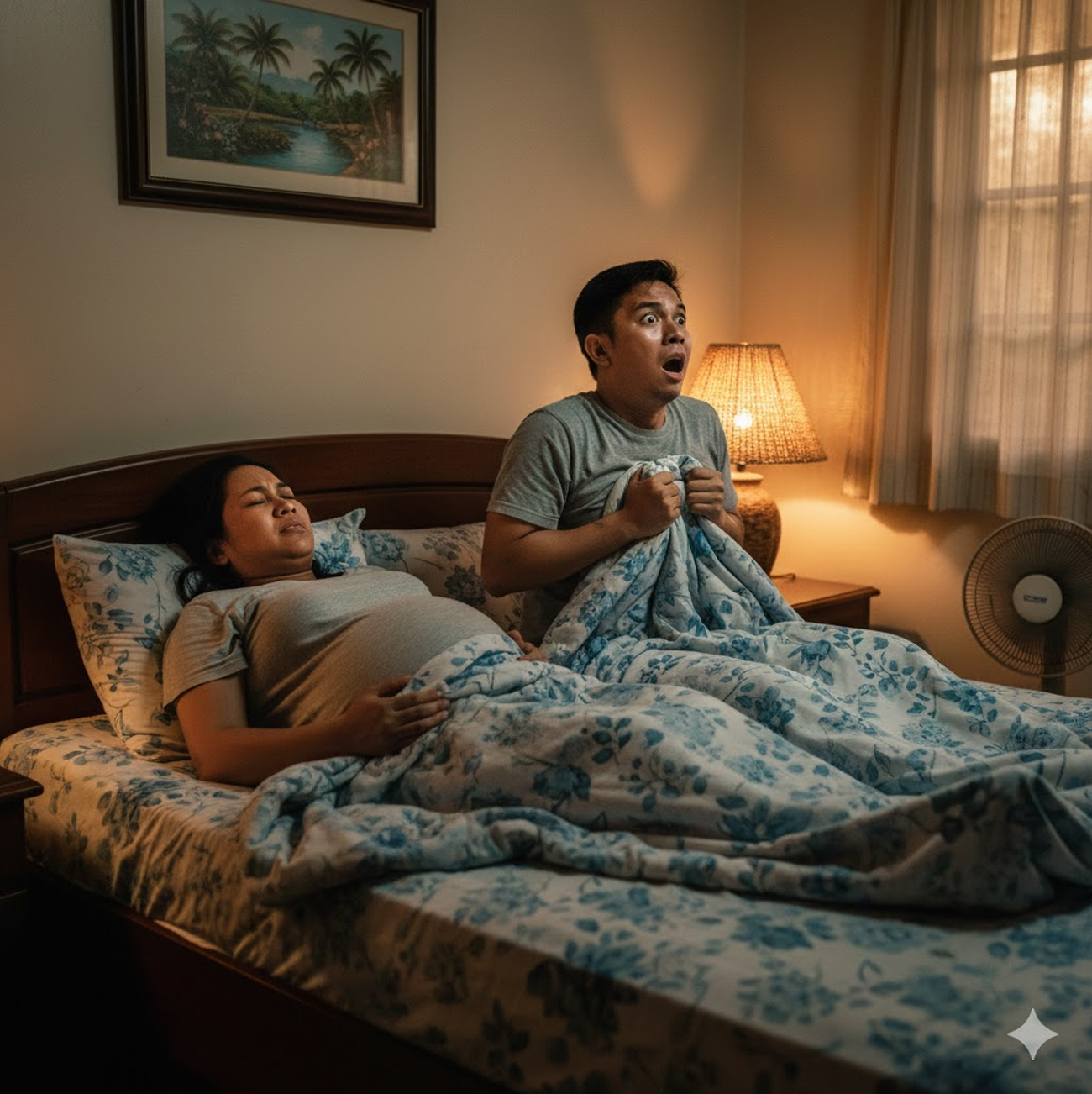 The six-months-pregnant wife refuses to get out of bed; the husband, suspecting something, lifts the blanket and begins to tremble at the sight before him.