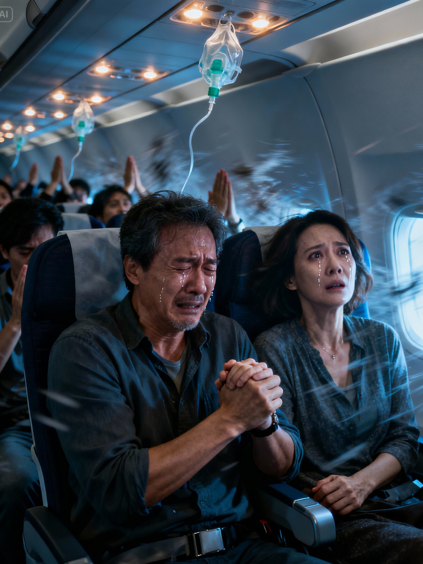 Umuga ang eroplano na parang lata sa gitna ng bagyo. Ang mga ilaw sa kisame...